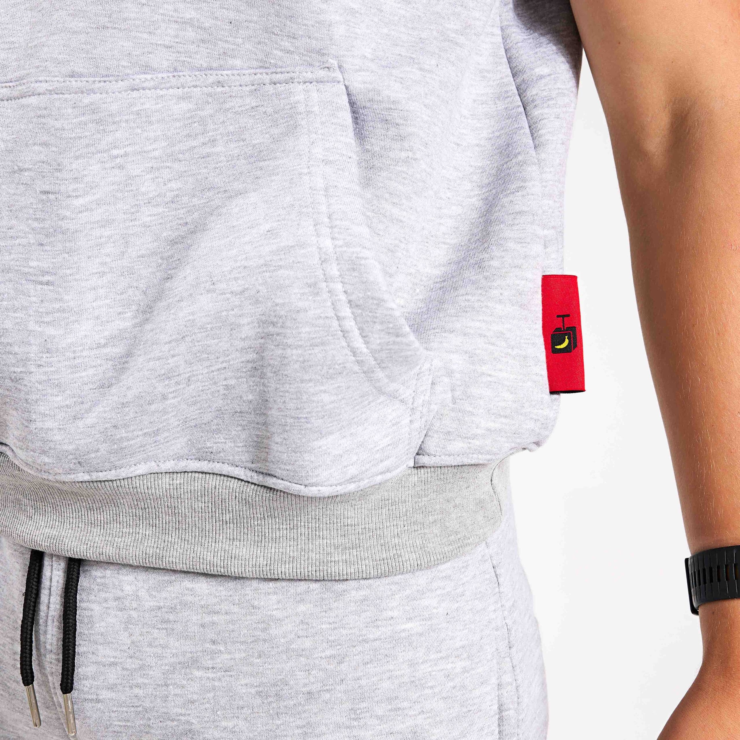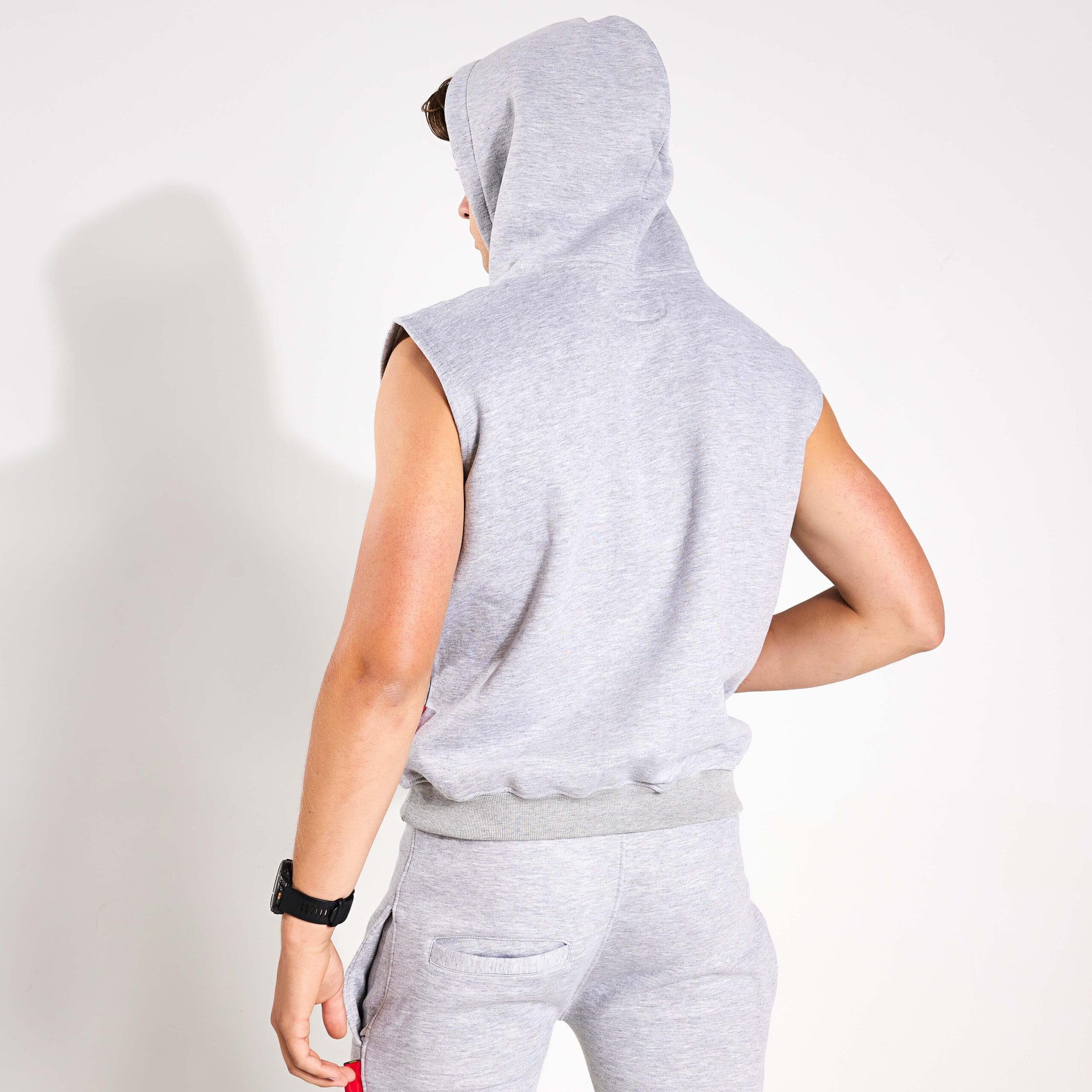 Embrace your casual style with the Guerrilla Sleeveless Hoodie. Crafted from heather grey cotton, this hoodie features a sleek detonator logo embroidered on the left chest and functional kangaroo pockets for a touch of practicality. Ideal for those who move with purpose and seek a blend of edgy design and everyday comfort.
